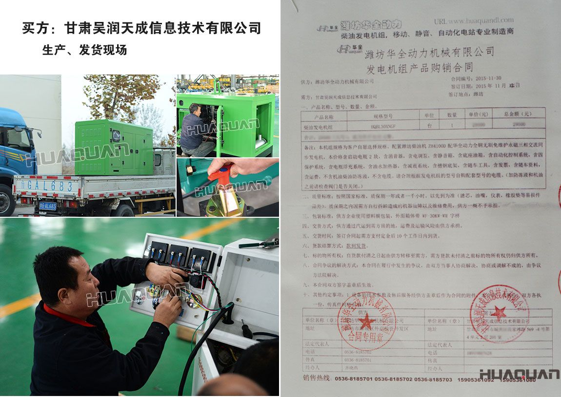作為信息技術(shù)公司離不開電力的支持。為了避免因缺電、停電而造成的經(jīng)濟(jì)損失。甘肅吳潤天成信息技術(shù)有限公司在2014年8月30日、2015年11月12日分別在華全動(dòng)力采購一臺(tái)柴油發(fā)電機(jī)組。