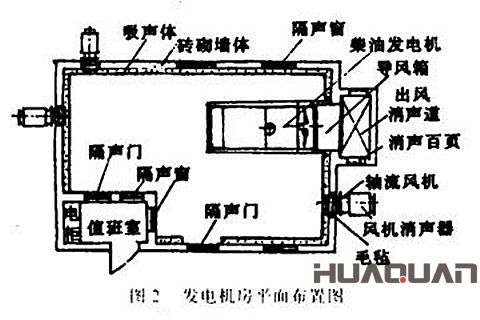 將值班室與發電機房分開,值班室內墻安裝隔聲窗,便于觀察發電機的運行。機房與值班室之間設出入口,門洞上安裝隔聲門,減少機房傳至值班室內的噪聲,同時也便于操作。