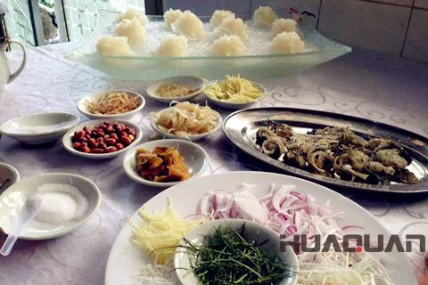 魚(yú)生在順德隨處可見(jiàn),價(jià)格也相當(dāng)親民,很多順德人,兩天不吃魚(yú)生,就覺(jué)得腸胃里少了點(diǎn)兒什么,渾身不舒服。魚(yú)就是草魚(yú),一片一片在盤(pán)上。這種片成薄薄的魚(yú)生,爽滑,入口清脆。冰好的魚(yú)生上了桌,將生魚(yú)片放入碟子中,再放一點(diǎn)生油拌一下,接著加入一點(diǎn)鹽、蔥絲、姜絲、檸檬絲、蒜片、糖就可以吃了。有些地方的配料還會(huì)更豐富一些,比如多了辣椒絲、大頭菜、豉油、芝麻、花生等等,冰涼爽滑的魚(yú)生入口,各種調(diào)味料的復(fù)雜口感將魚(yú)生的鮮甜盡情地釋放出來(lái),很是美妙!