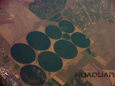 沙特阿拉伯的農場呈圓盤狀,通常都會在沙漠中。水是生命之源。在沙漠農場,這句話更有意義。在沙漠的農場,農場主會打許多深井,灌溉農田的水全部來自深井。圓盤巨大,人工澆水根本不可能。他們采用的灌溉手段是這個樣子的: