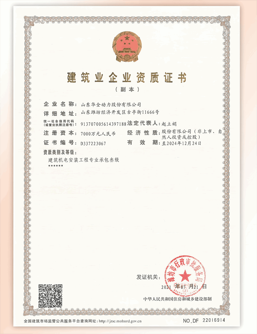 華全電力除了卓越的研發實力和生產能力,還具有優秀的施工能力,已經取得了建筑機電安裝工程專業承包叁級資質,可承接一般工業和公共、民用建設項目相關設備的安裝。